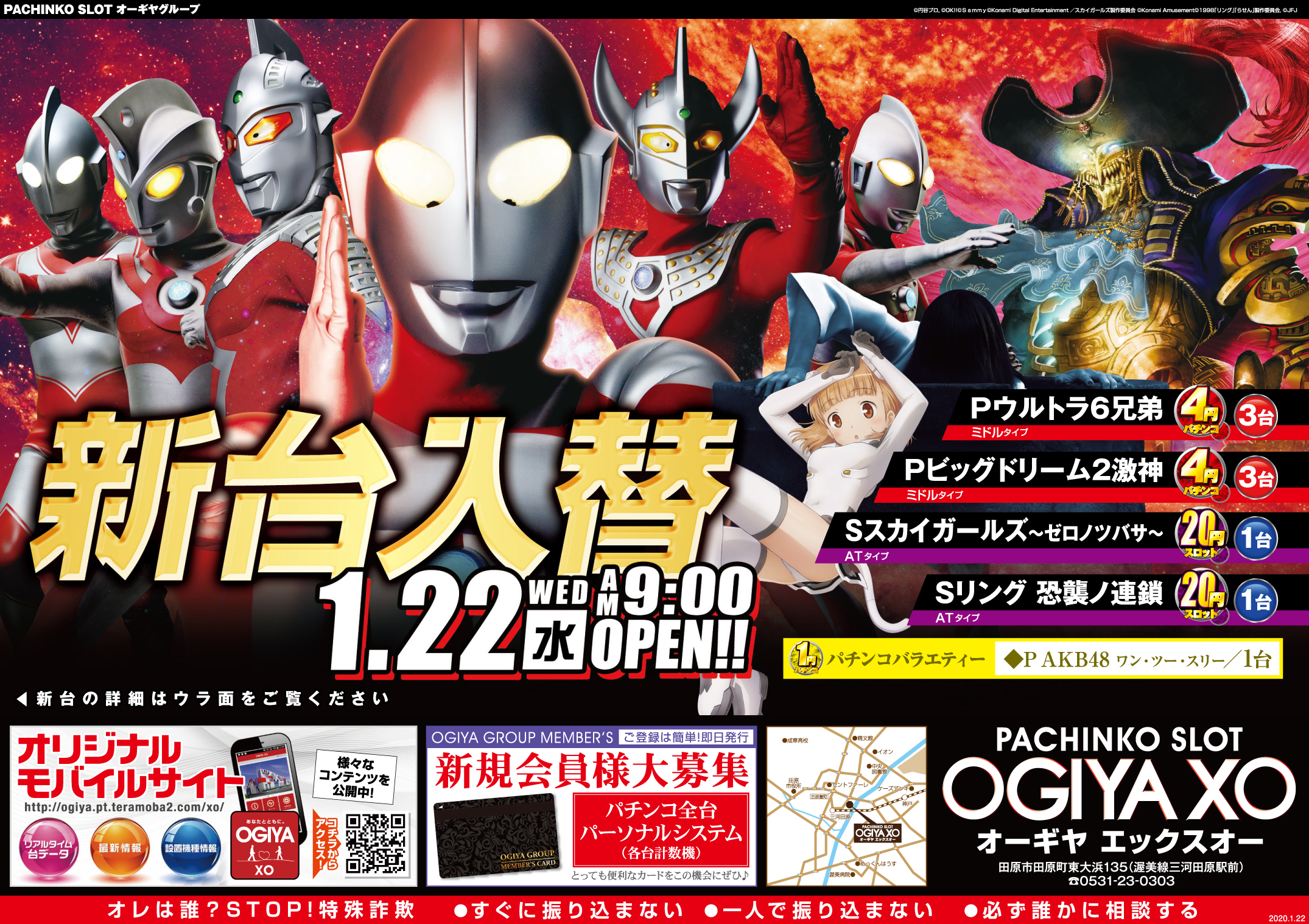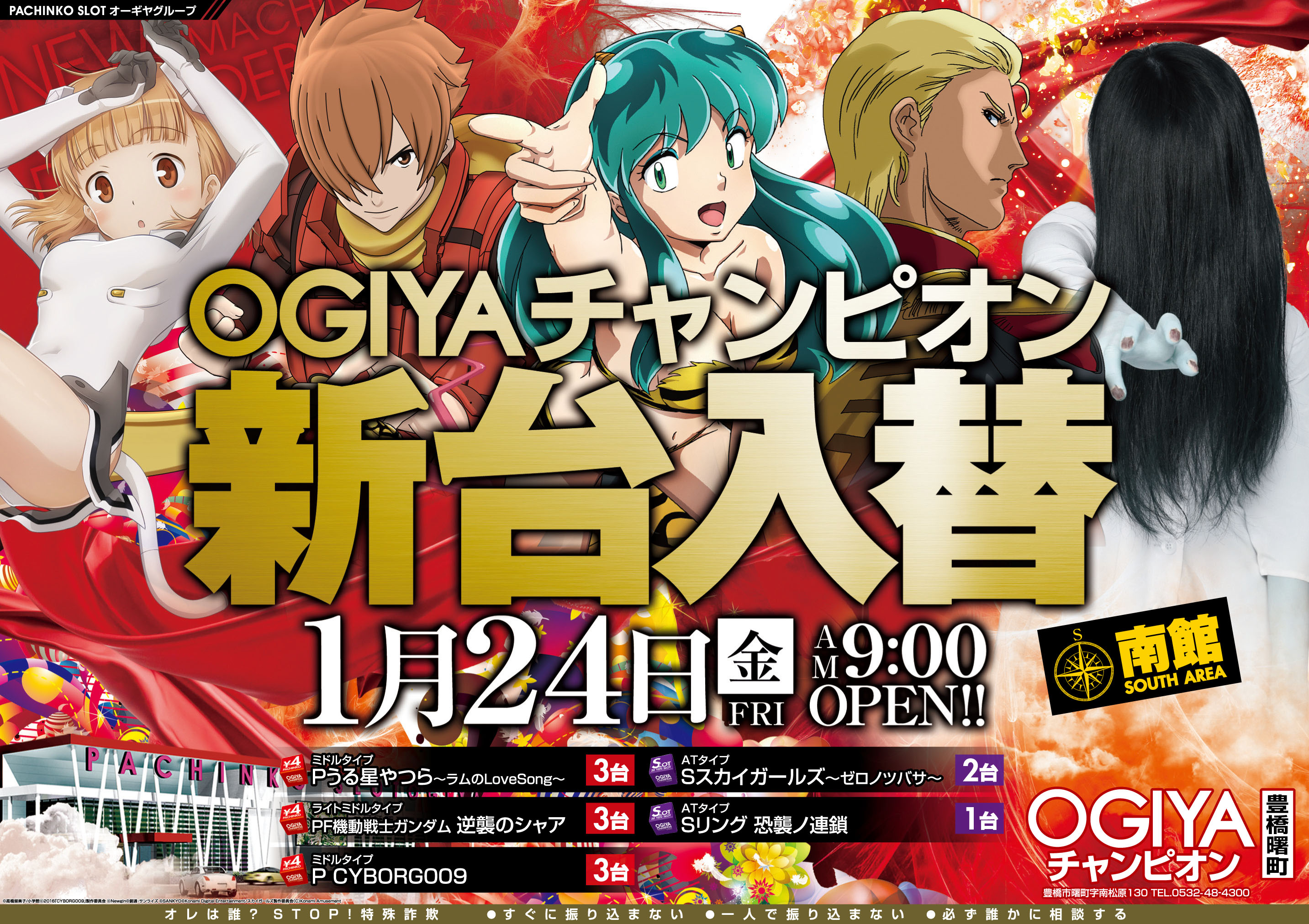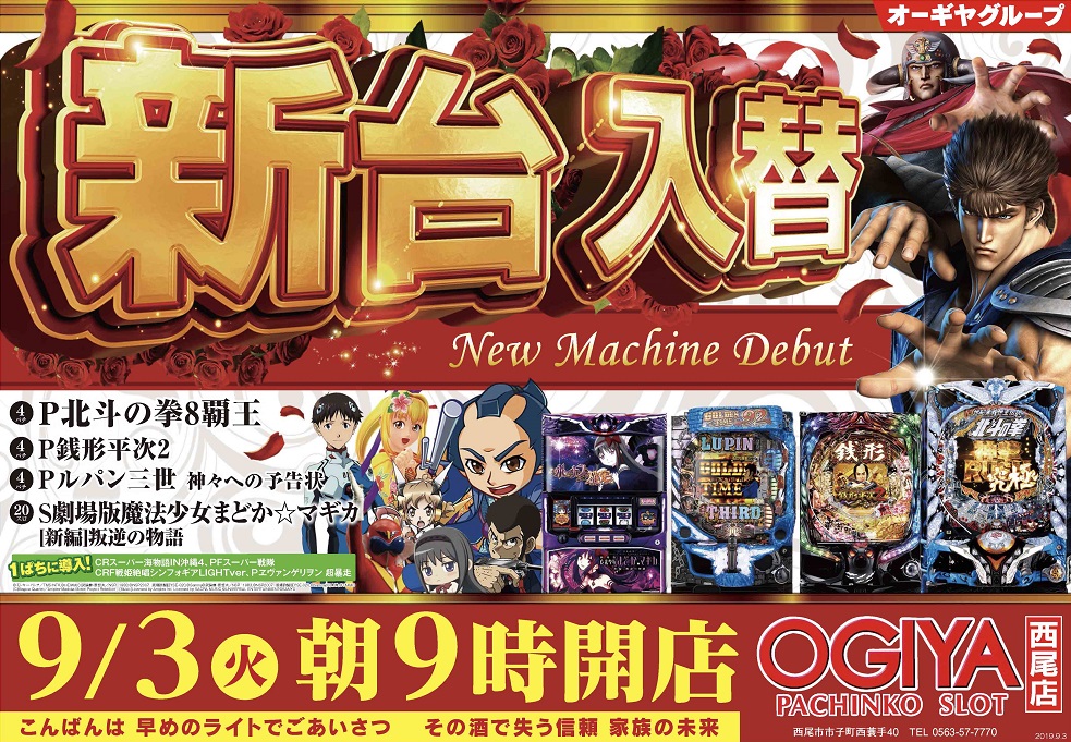 9/3新台初日!4円パチンコ:北斗の拳8、銭形平次2、ルパンⅢ世 1円パチンコ:スーパー戦隊、エヴァンゲリヲン超暴走、スーパー海物語IN沖縄4、シンフォギアLight.ver 20円スロット:劇場版まどか★マギカ 最新機種を是非お試しください♪